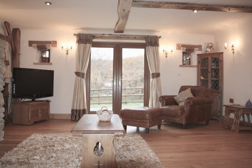 Living room: With wood burner, satellite TV, DVD player with a selection of DVDs, CD player and patio doors leading to patio.